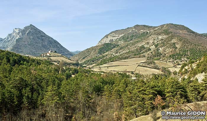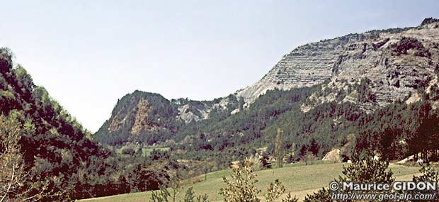 Cette disposition porte à conclure que ces deux surfaces n'en font qu'une et que le chevauchement des Auches résulte sans doute d'une véritable décapitation de l'anticlinal du Pape, au sein d'un matériel autochtone repoussé devant l'avancée du front de la nappe : c'est en fait là un dispositif tectonique comparable et même similaire à celui que l'on observe, plus au sud, au niveau d'Astoin : l'un comme l'autre témoignent de ce que le matériel de la nappe de Digne s'est affronté lors de son déplacement vers le sud-ouest à l'existence de paléoreliefs autochtones déjà structurés qu'il lui a fallu contourner (cas du lobe nord-occidental de la nappe) ou bousculer (cas du lobe médian). |