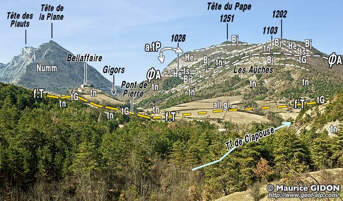 La présence d'une lame de Lias renversé, traversant les pentes au NE de Gigors y met en évidence l'existence d'un chevauchement des Auches par l'intermédiaire duquel la succession de la Tête du Pape repose en fait sur les Terres Noires de la dépression occidentale de Turriers.