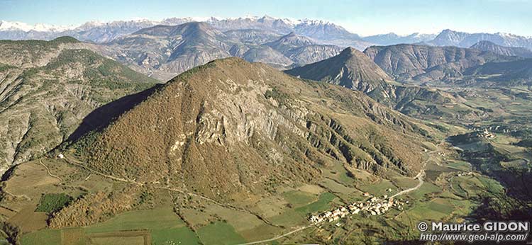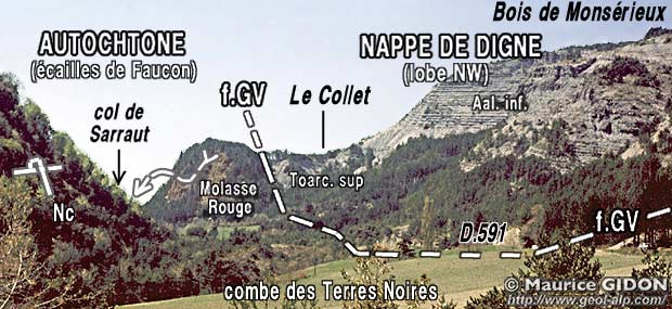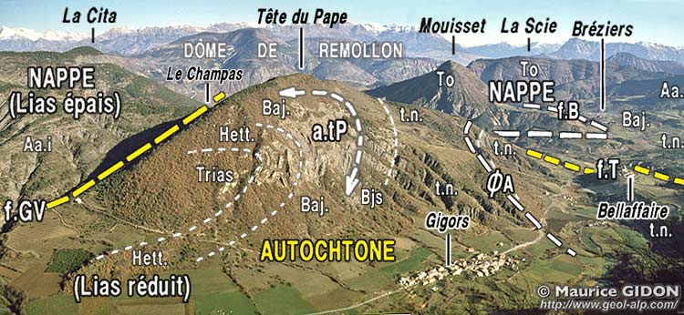![]() Gigors et la Tête du Pape, en vue plongeante, du sud vers le nord, depuis la Tête de la Plane. f.GV = faille du Grand Vallon ; f.B = faille de Bréziers ; f.T = faille de Turriers ; a.tP = anticlinal de la Tête du Pape ; ØA = chevauchement des Auches (il est possible qu'il se prolonge au sud de Gigors, sous les formations quaternaires, en se raccordant au chevauchement de La Plane : voir la page "Turriers"). Cette vue montre la fermeture septentrionale de la dépression autochtone de Turriers, cernée par les terrains de la nappe de Digne (la séparation entre nappe et autochtone est toutefois réalisée presque partout par des failles subverticales (soulignées de jaune) qui affaissent la nappe par rapport à son autochtone). La surface de chevauchement visible dans les gorges du torrent de Clapouse ne fait que reposer le lobe NW de la nappe sur le lobe médian (de Bréziers). L'anticlinal de la Tête du Pape est vu ici un peu en oblique par rapport à son axe, qui est orienté NE-SW, c'est-à-dire presque parallèle au plan de la faille du Grand Vallon. On voit bien que ce pli est déversé vers le sud-est et tranché du côté gauche (nord-ouest) par la faille du Grand Vallon. Cette disposition, tout à fait anormale pour la région, s'explique sans doute par le fait que l'origine de ce pli serait un rebroussement des couches, par l'effet de l'avancée ce lobe de la nappe vers le S-SW, en oblique par rapport à la faille du Grand Vallon (qui avait alors un jeu coulissant sénestre). |