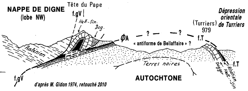 ![]() Coupe un peu au NE de Gigors, passant par la Tête du Pape et le quartier des Vignes, au nord de Turriers (extrait de la publication n°067, retouché). f.gV = faille du Grand Vallon ; f.T = faille de Turriers ; ØA = chevauchement des Auches : la comparaison avec la coupe du torrent de Clapouse suggère que la lame de Lias réduit renversé que recouvre cet accident se raccordait par ploiement antiforme* avec la succession de Turriers, par dessus les Terres Noires de Bellafaire |