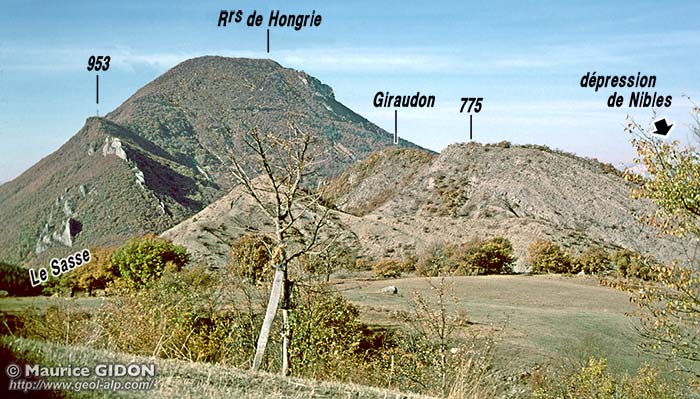 La route D.551, qui remonte la vallée en suivant rive droite du Sasse, contourne l'éperon des calcaires carixiens verticaux du flanc sud pour traverser, au pontet 574, le vallonnement des couches triasiques jalonnant la faille. Immédiatement en amont de ce point le Sasse traverse en gorge la barre rocheuse à l'extrémité orientale de laquelle s'appuie (sur l'autre rive) le village de Châteaufort. Elle est constituée par la succession des couches du Lias puis du Dogger du flanc nord de l'anticlinal de Hongrie, laquelle se poursuit en continuité stratigraphique par les Terres Noires du flanc sud du synclinal de Nibles (elles affleurent dès le débouché nord de la gorge). La faille de Châteaufort, orientée ici W-E, passe au sud du village, en suivant le cours tout-à-fait inférieur du Ruisseau de Pene et les couches calcaires de la barre du flanc nord de l'anticlinal se biseautent rapidement d'ouest en est contre elle : cela ne laisse affleurer plus à l'est, au pied de la crête du Rocher Saint-Laurent, que les Terres Noires de cette lèvre septentrionale de la faille. |