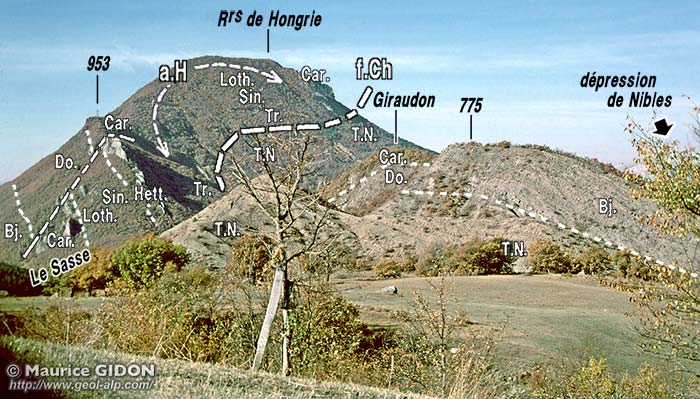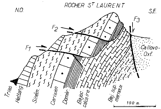 Au NE du Rocher Saint-Laurent c'est une cassure secondaire presque N-S qui coupe en biseau la barre du Lias-Dogger du flanc sud de l'anticlinal de Hongrie et fait que ce sont les Terres Noires s'appuient directement contre la lame de terrains triasiques qui jalonne la faille de Châteaufort (voir la page "Nibles") . |