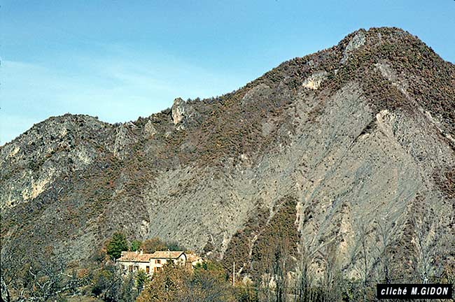 Par ailleurs la charnière de ce pli est dissymétrique car son flanc oriental tombe plus brutalement que l'occidental. Cette dissymétrie est accentuée par le fait que, au SE de l'aplomb du sommet, le versant oriental de la crête est rompu à mi-hauteur des escarpements boisés de ce versant par une faille parallèle à l'axe du pli : on peut l'appeler faille de Châteaufort car son tracé se poursuit vers le sud-est en passant par cette localité. Son rejet presque nul au nord du sommet s'accroît rapidement vers le sud : à l'est du pylône EDF coté 953 sur la crête elle abaisse sa lèvre orientale jusqu'à faire buter les Terres Noires de la dépression synclinoriale* de Nibles contre les couches triasiques du pied de la succession formant sa lèvre occidentale.