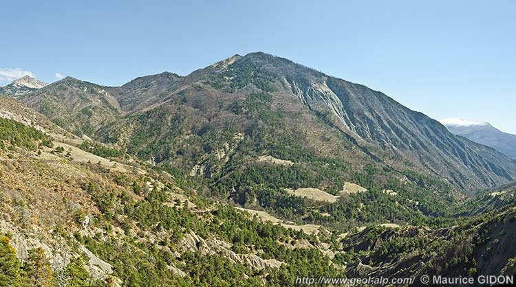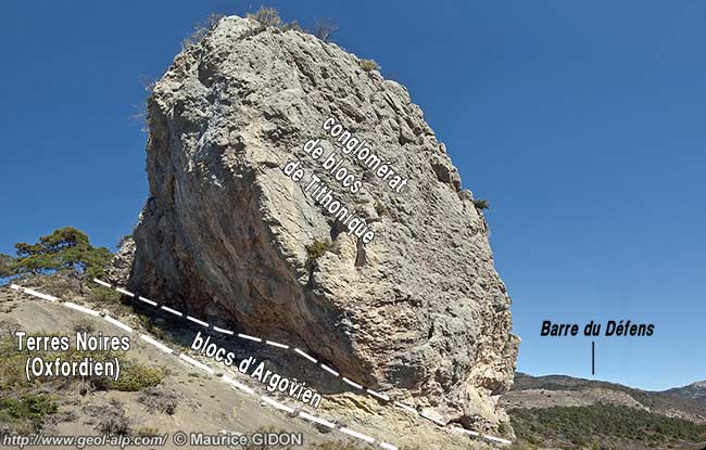 Les pentes ravinées du fond du vallon et de sa rive droite, au sud-ouest et en contrebas de cette barrière rocheuse du Défens, sont formées de Terres Noires dont on voit qu'elles sont ployées par un anticlinal du Défens, d'axe E-W : la barre de conglomérats oligocènes du Défens en constitue la couverture stratigraphique normale (et l'on voit effectivement bien les lits conglomératiques dessiner une charnière fortement déjetée vers le nord).