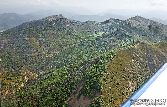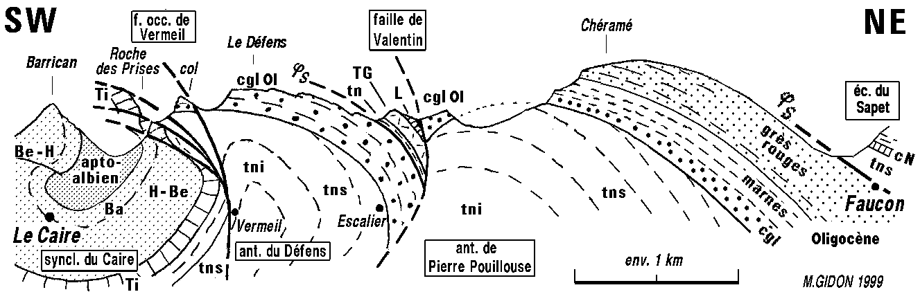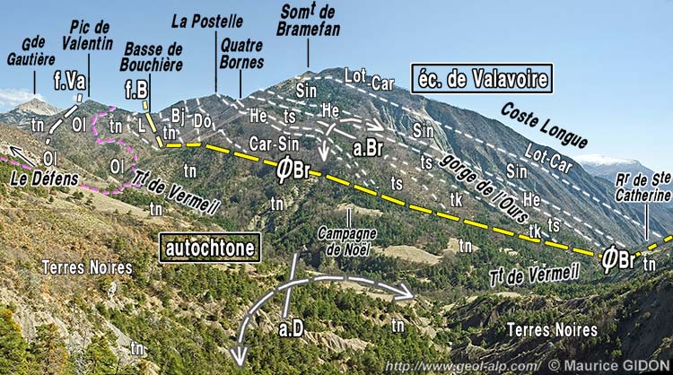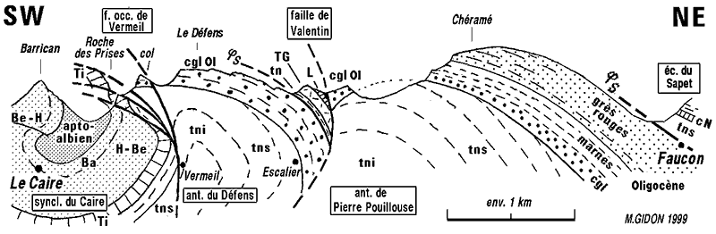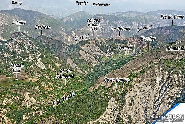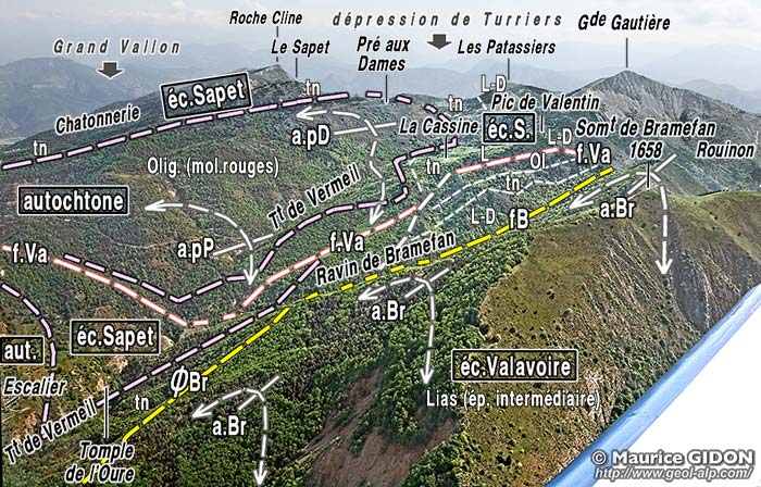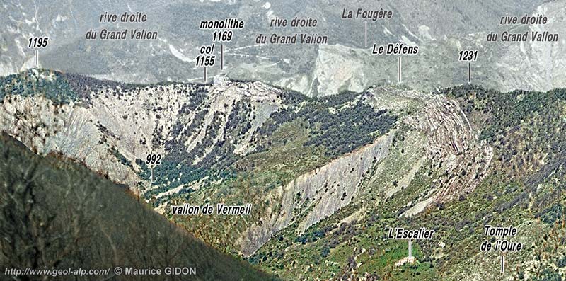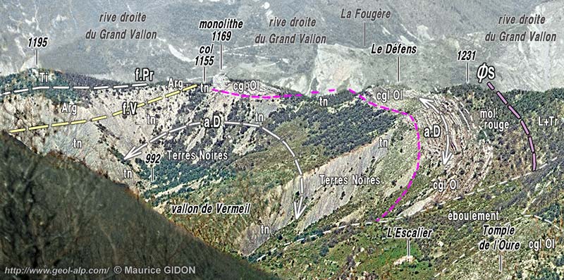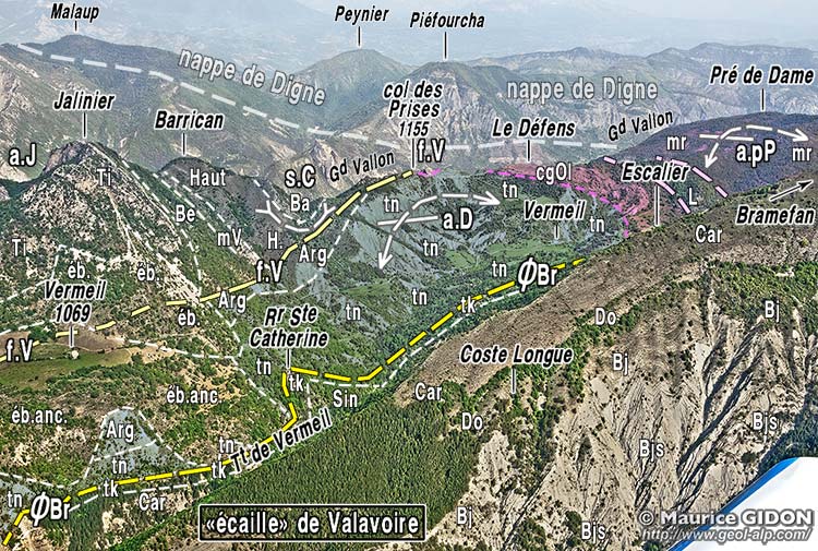 ![]() La rive droite du vallon de Vermeil sur la transversale d'Escalier vue de l'est depuis le Pic de Valentin, devant les montagnes de la rive nord-ouest du Grand vallon (l'arrière-plan, ici surchargé d'un voile clair, est visible et commenté à la page "Le Caire"). f.V = faille de Vermeil ; f.Pr = faille des Prises (faille à faible pendage et rejet vers le SW) : du côté opposé de la crête elle sectionne à son sommet la barre tithonique de la Roche des Prises ; aD = anticlinal du Défens ; ØS = chevauchement de l'écaille du Sapet (enroulé par l'anticlinal du Défens). |