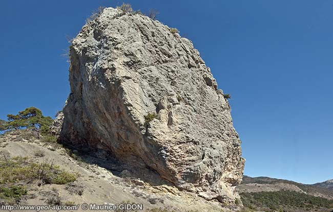 Aux abords du col coté 1155 cette cassure tranche les conglomérats oligocènes de la barre du Défens et les juxtapose aux Terres Noires du ravin qui descend vers la Roche du Caire. Plus à l'ouest dans ces pentes supérieures de la rive gauche du Grand Vallon (voir la page "Le Caire") elle est accompagnée de plusieurs plans de faille satellites moins pentés dont le plus important qui tranche le sommet de la barrière tithonique de la Roche des Prises. Entre cette cassure et la faille principale de Vermeil, dans le versant ouest du col et sur la crête plus au sud, on retrouve le Tithonique, décalé vers le sud sous la forme de navettes* (c'est-à-dire de copeaux fusiformes jalonnant les plans de cassure).