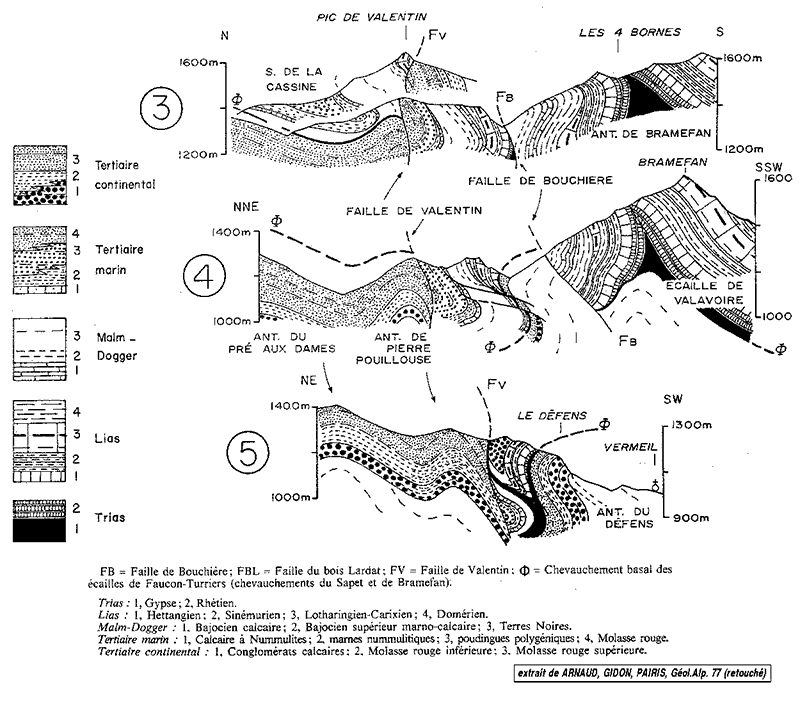 (extrait de la publication n°075 ) Coupes N-S successives, d'est (3) en ouest (5), des abords du vallon de Vermeil dans son trajet E-W au flanc sud de la montagne du Sapet (N.B. le nom Vermeil désigne la localité amont portant ce nom, voisine de la ferme d'Escalier. Ø = surface de chevauchement de l'écaille du Sapet et du Bramefan (partie droite des coupes 3 et 4) ; FV = faille de Valentin ; FB = faille de Bouchière. |