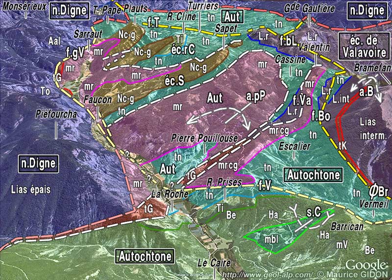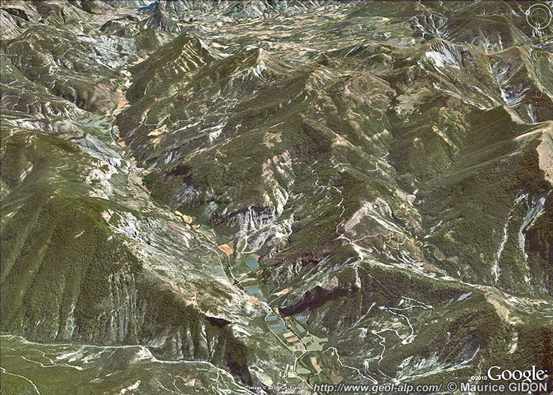 ![]() d'après une image extraite de "google-earth" Le Grand Vallon et les montagnes de sa rive sud-orientale (système des écailles de Faucon), vus de l'ouest. f.gV = faille du Grand Vallon (limite nord-occidentale du "redent de Turriers" de la nappe de Digne) ; f.V = faille de Vermeil (prolongement possible de la précédente, dans l'autochtone) ; ØBr = chevauchement du Bramefan (s'embranchant plus au sud sur la faille de Vermeil) ; f.Bo = faille de Bouchière ; f.bL = faille de Bois Lardat ; f.T = faille de Turriers (ces 4 dernières failles s'alignent grossièrement pour jalonner le linéament de Clamensane et limiter le système des écailles de Faucon du côté oriental) Toutes les failles ci-dessus énumérées, dont les tracés sont indiqués en jaune, ont eu un jeu post-nummulitique en liaison avec l'avancée de la nappe de Digne ; la surface de chevauchement proprement dite de cette dernière est indiquée en rose. éc.S = écaille du Sapet ; éc.cC = écaille de Roche Cline ; f.Va = faille de Valentin ; a.pP = anticlinal de Pierre Pouillouse ; a.B = anticlinal du Bramefan ; s.C = synclinal du Caire. Nc-g = calcaires et grès verts à conglomérats nummulitiques supportant les molasses rouges dans les écailles de Faucon. L'autochtone du domaine des écailles de Faucon se distingue de celui du Caire par l'absence des terrains plus récents que les Terres Noires, qui y ont été enlevés par l'érosion anté-oligocène. |