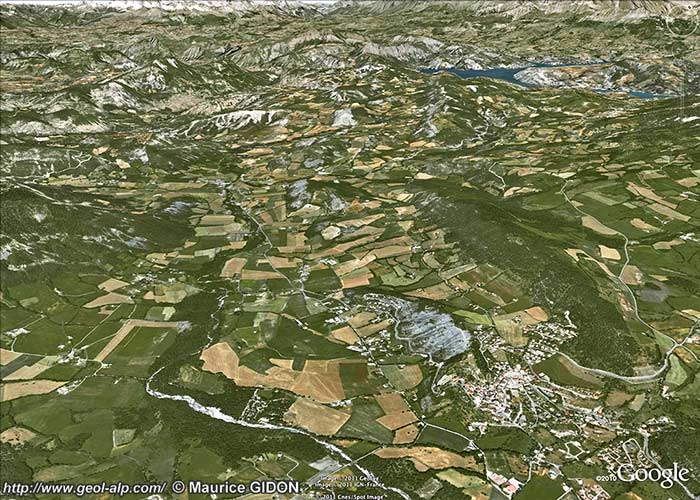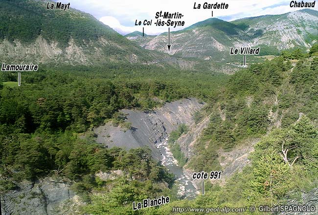 C'est plus au nord, en aval du hameau du Château (6 km en aval de Selonnet), que la vallée de la Blanche s'encaisse progressivement en entaillant les couches plus calcaires du Lias du flanc ouest de l'anticlinal d'Espinasses (= du Dôme de Remollon oriental) et finit par rejoindre la vallée de la Durance, à la hauteur d'Espinasses, par des gorges entaillées dans le Lias calcaire. |