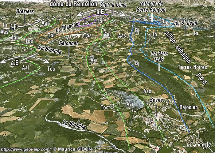 Le charriage de cet ensemble est attesté par le fait que son Trias et son Jurassique inférieur reposent, peu au sud-ouest, à la montagne de Blayeul, sur les terrains autochtones très différents des environs de Barles. Mais cette tranche inférieure de sa série stratigraphique ne peut être dissociée des termes plus récents qui, précisément, se développent aux abords de Seyne, jusqu'à la crête de la Blanche inclusivement : à ce titre la région de Seyne doit donc être considérée comme faisant partie de la "nappe de Digne", même si le déplacement tectonique que cela implique reste modeste, bien moindre que celui des nappes plus internes dont les premiers témoins se rencontrent à peine plus à l'est, dans la basse vallée de l'Ubaye. |