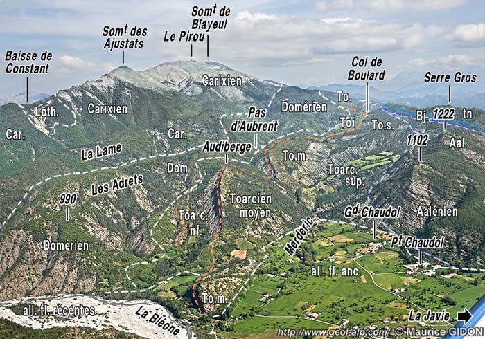 Du côté occidental les escarpements du crêt de Blayeul laissent voir, au gré des ravins, les détails de la surface de charriage de la nappe de Digne (qui recouvre des couches d'âges variés, jusqu'au Tertiaire récent) et des dislocations qui affectent son autochtone sous-jacent (ce dernier y affleure à la faveur de la "demi-fenêtre de Barles").