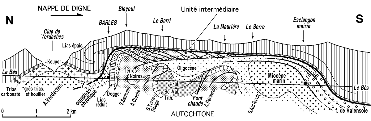 Les structures du soubassement autochtone de la nappe observables à la latitude septentrionale qui est celle du sommet de Blayeul et du village de Barles sont décrites aux pages Verdaches et Proussier ; les structures des parties plus méridionales du versant ouest du chaînon sont décrites dans les pages "Barri", "Rousset" et "Aiguebelle".