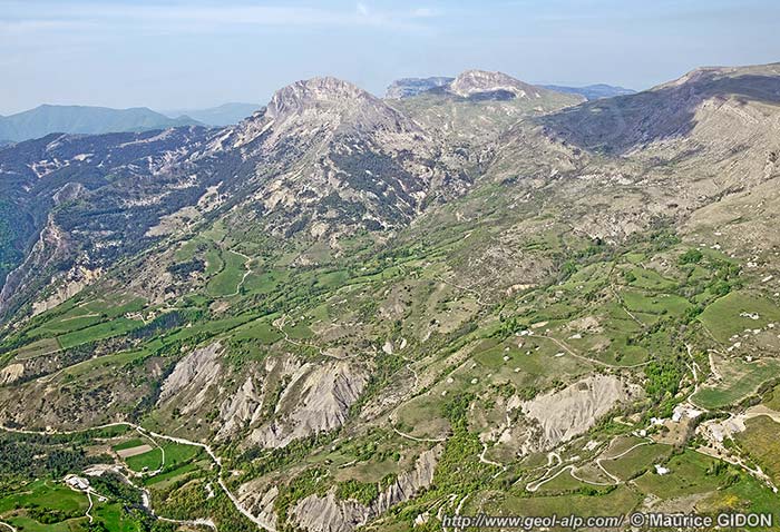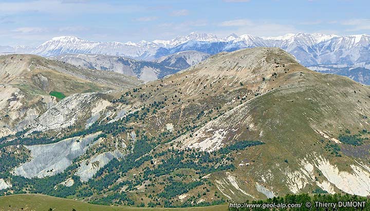 Ce dernier col est ouvert dans les Terres Noires à miches grises de l'Oxfordien, tandis que les niveaux à nodules chocolat du Callovien affleurent dans les ravines immédiatement plus septentrionales (voir la colonne stratigraphique). |