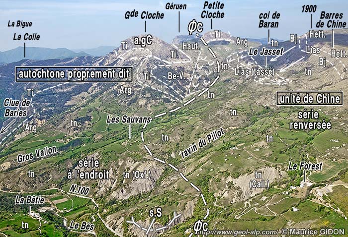 Plus à l'est dans ce versant sud-est de la montagne de Chine, à partir des Sauvans, n'affleurent plus que des Terres Noires, souvent masquées d'ailleurs par un important épandage de matériel ébouleux et de paquets glissés. Pourtant on parvient à y suivre la trace du chevauchement de Chine qui traverse le ravin du Forest en contrebas de ce village. Plus à l'est il atteint le lit du Bès peu en amont et le traverse pour s'élever presque symétriquement sur l'autre versant. C'est la continuité de cet accident qui individualise l'unité de Chine, en la séparant ainsi du reste de l'autochtone de la demi-fenêtre de Barles (voir la page "Barles Clue").