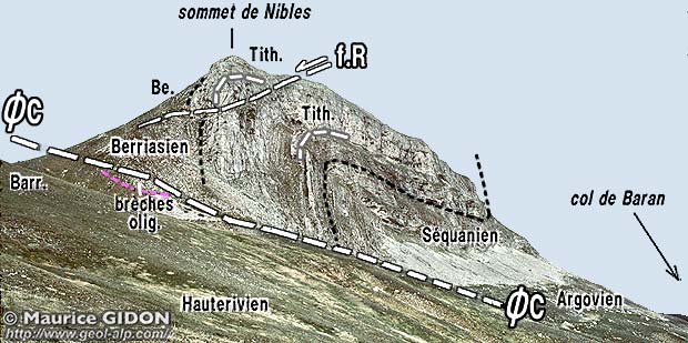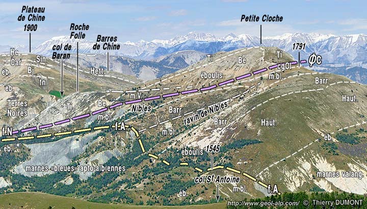 Le chevauchement de Chine y change de caractère en se connectant, aux abords du col de Baran, à la "faille de Nibles". Cette faille est la plus orientale du faisceau d'accidents coulissants du système des Monges, qui court entre le col de Baran et celui de la Croix de Veyre (voir les pages "Chine" et "Feissal") ; elle a un pendage plus proche de la verticale et un azimut proche de N-S.