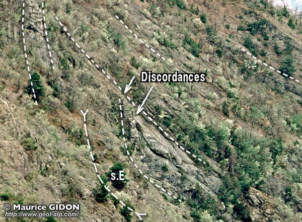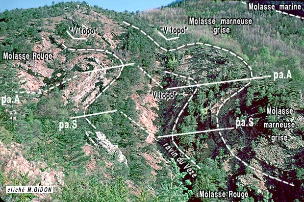 En fait l'examen de la disposition des diverses couches de ce versant montre, à plusieurs niveaux de leur succession, des discordances de onlap* qui affectent les couches de la molasse miocène et qui s'alignent à peu près selon un tracé presque parallèle à la crête.