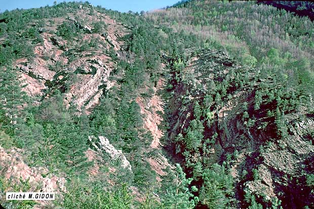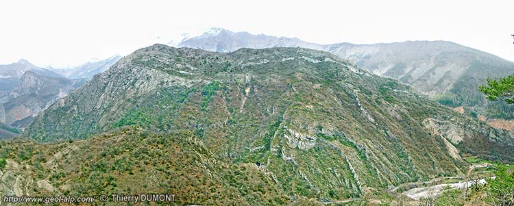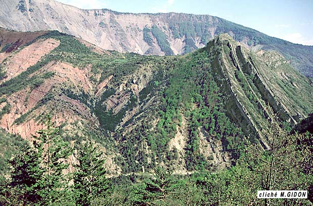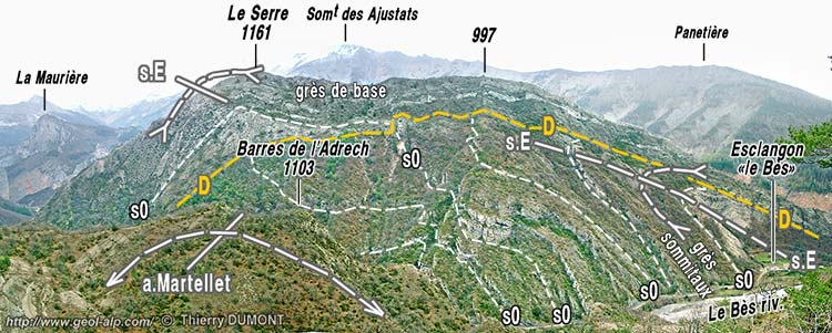 la crête vers le sud. Cette torsion des pendages est celle induite par le synclinal d'Esclangon, dont la charnière traverse en biais le haut des pentes