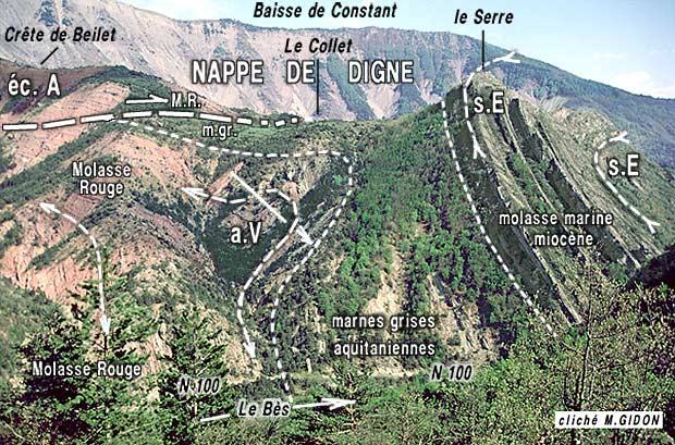 ![]() Les pentes septentrionales du Collet d'Esclangon vues du nord-ouest, depuis Roche Rousse. Cette coupe naturelle de la rive gauche du Bès (où s'élève le sentier d'accès depuis la clue de Pérouré), montre la partie basse de la succession tertiaire du synclinal d'Auribeau, affectée par les détails structuraux annexes, au raccord entre le flanc sud de l'anticlinal post-oligocène de la Maurière et le flanc nord du synclinal d'Auribeau. éc.A = écaille d'Aiguebelle ; a.V = anticlinal du ravin du Vèze (pour plus de détails voir cliché ci-après) ; s.E = synclinal d'Esclangon (les axes, N-S, de ces deux plis ont été basculés vers la droite, c'est-à-dire vers le sud, lors de la formation du synclinal est-ouest d'Auribeau). Les terrains liasiques de la nappe de Digne sont visibles en arrière plan mais la surface de chevauchement de cette nappe est masquée derrière la crête du Collet. |