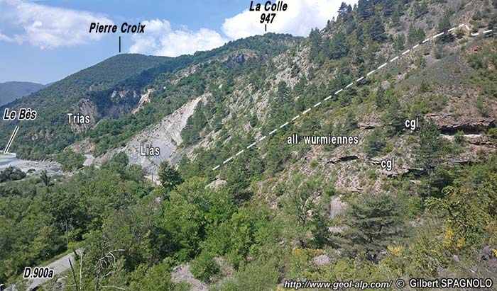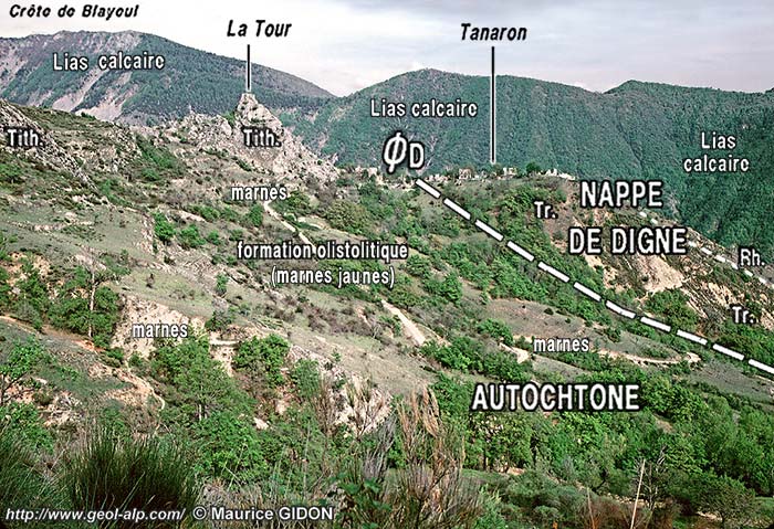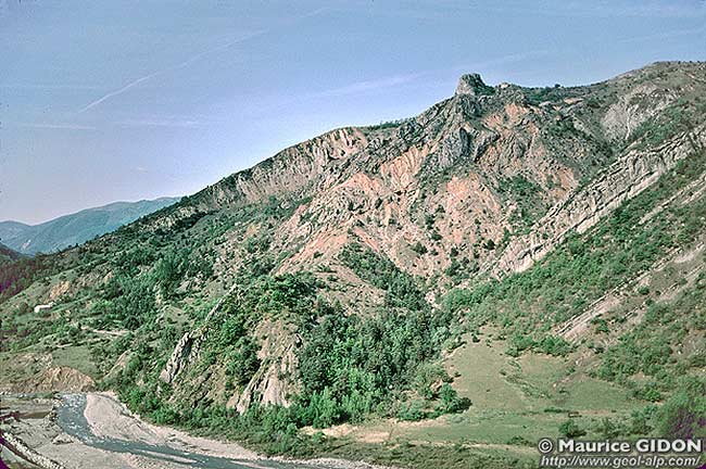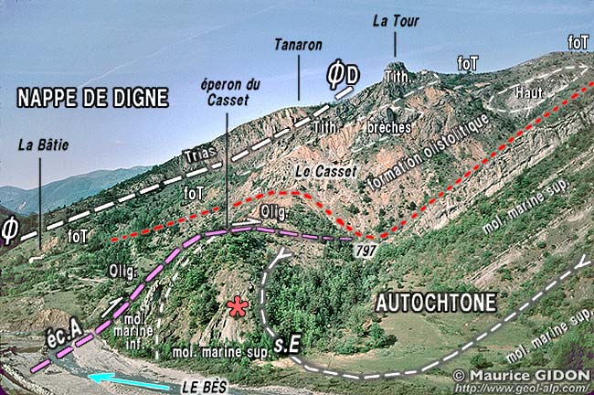 ![]() Les pentes de rive droite du Bès, en amont de Tanaron vues de la rive gauche du Bès, depuis les pentes inférieures du Serre d'Esclangon ØD = surface de chevauchement de la nappe de Digne ; éc.A = écaille d'Aiguebelle (matériel de Molasse Rouge oligocène) ; s.E = synclinal d'Esclangon (le cliché est pris sensiblement dans son axe). Les affleurements visibles ici sous la nappe appartiennent presque tous à la "formation olistolitique de Tanaron" (foT). Les affleurements mésozoïques qu'elle contient (Tithonique et Hauterivien surtout) sont des olistolites*, emballés dans une matrice marneuse plus ou moins jaune ou rouge. Cette formation remplace ici la formation de Valensole, affleurant plus au nord dans la même situation, sur la molasse marine supérieure (voir le cliché suivant et la page "Vélodrome") : L'astérisque rouge désigne l'emplacement où s'observent des discordances intraformationnelles au sein de la molasse marine supérieure : images et commentaires sur ce sujet à la page "Esclangon") |