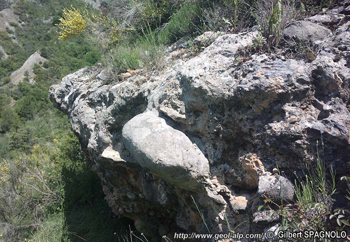 ![]() Vue rapprochée d'un lit conglomératique montrant des galets de grosse taille (dépôts de crue). (cliché original obligeamment communiqué par Mr. G. Spagnolo) |