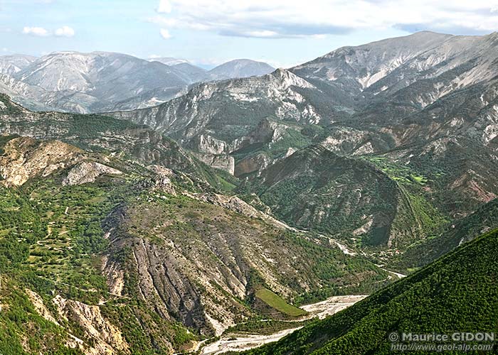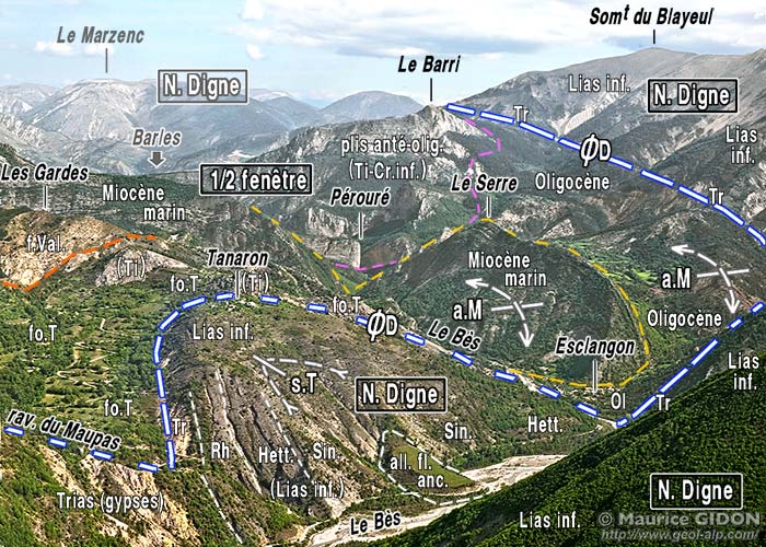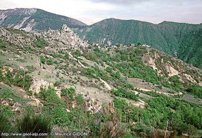 Ce chevron est entaillé symétriquement par deux ravins, l'un et l'autre affluents de rive droite du Bès : le vallon de La Bâtie, qui descend du côté nord-est sur le village d'Esclangon, et le profond ravin du Maupas, qui rejoint le Bès plus en aval et plus à l'ouest. L'un comme l'autre percent les couches les plus inférieures de la nappe et même sa surface de chevauchement et atteignent ainsi son soubassement autochtone, qui est formé ici par la "formation olistolitique de Tanaron".