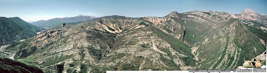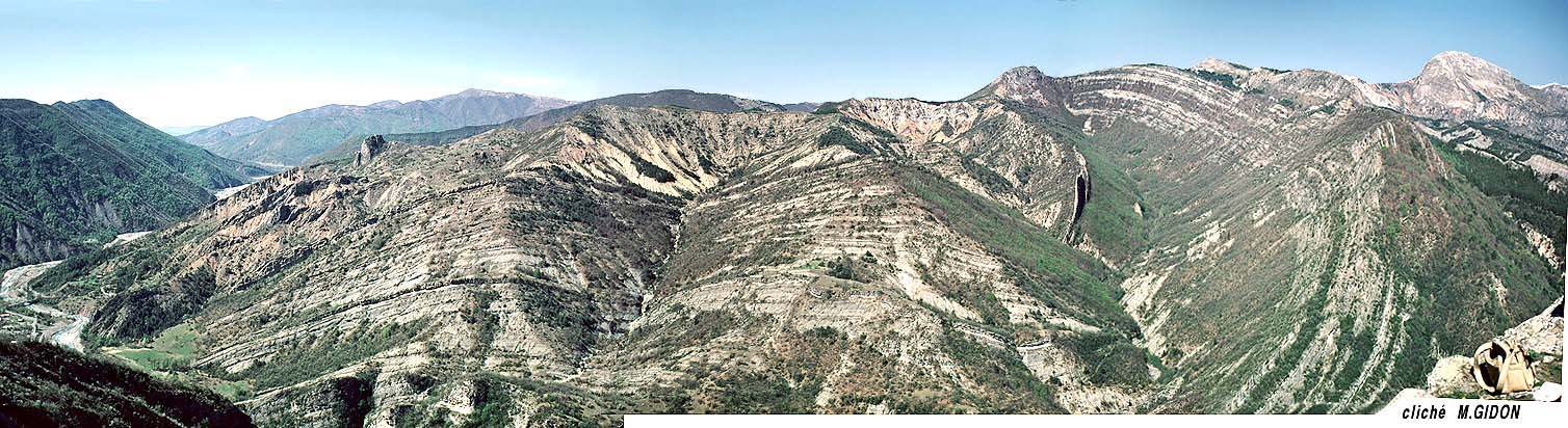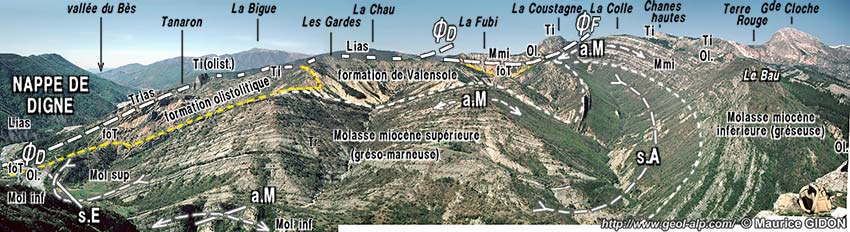 ![]() version beaucoup plus grande, Le "vélodrome", en rive droite du Bès, vu de l'est, depuis le sommet du Serre d'Esclangon [panorama de N 210 (à gauche) à N 310 (à droite)] (la localité d'Esclangon est située à l'extrémité gauche du cliché). À l'emplacement de l'entaille N-S de la vallée du Bès l'axe du synclinal d'Auribeau se relève rapidement d'ouest en est (c'est-à-dire transversalement à la vallée, vers l'observateur : l'axe du pli devient même vertical sous ses pieds) du fait de son interférence avec le synclinal d'Esclangon qui lui est orthogonal. À la faveur de cette disposition, l'érosion a sculpté une combe qui suit les niveaux marneux, relativement tendres, présents à mi-hauteur de la succession du Miocène marin, et s'enroule conformément à la torsion des couches par le pli. C'est la courbure des escarpements des grès qui forment le bord externe de cette combe (crêtes de la Colle et du Bau, en rive droite, et crête du Serre, en rive gauche) qui évoque la manière dont s'incline la piste cycliste dans les boucles d'un vélodrome. s.E = synclinal d'Esclangon (axe N160) ; a.M = anticlinal du Martellet (axe N110) ; s.A = synclinal d'Auribeau (axe N95) ; ØF = chevauchement de la Fubi ; ØD = chevauchement de la nappe de Digne (en arrière-plan des crêtes, sauf à gauche de Tanaron). |
