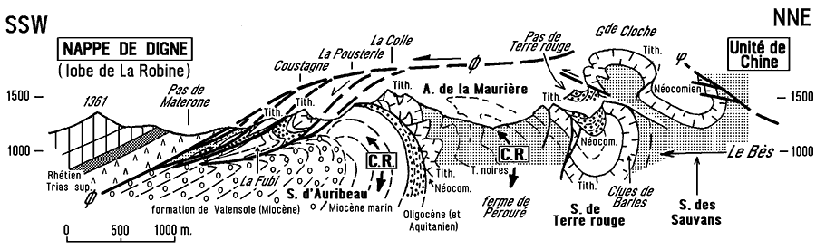 ![]() Coupe de rive droite du Bès Noter les failles, à caractères de "Riedels de la nappe", qui découpent le Miocène de la Pousterle et sont à l'origine du détachement de la lame de La Fubi et de la Coustagne. On a noté par "CR" quelques points jalonnant le passage de la "charnière de renversement" qui affecte toutes les structures jusqu'à l'unité de Chine et dont le plan axial passe peu au dessus du niveau de la vallée du Bès. |