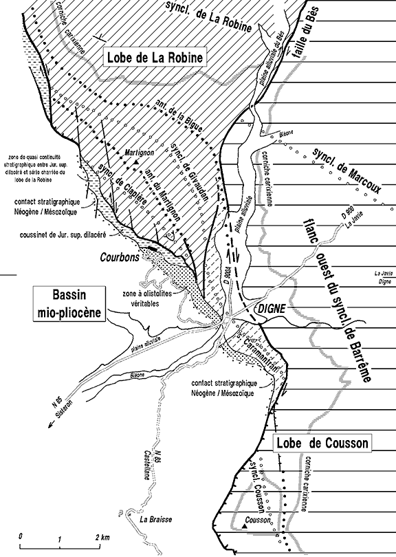 2.2 - Au nord-ouest de la Bléone, aux abords orientaux et septentrionaux de Courbons, le contact entre l'autochtone et la nappe (marge sud-ouest du lobe de la Robine) présente, à divers égard, un caractère d'ambiguité. Celui-ci est lié pour l'essentiel à son tracé (notamment par rapport aux plis), à son pendage et aux relations entre les couches du Mésozoïque et du Tertiaire, qu'il est censé séparer par chevauchement dans les publications de nombre d'auteurs.