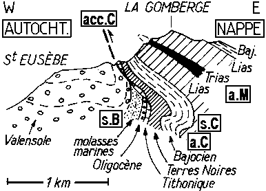 2.2.2.3 - Un problème plus difficile est posé par la klippe de Pié Gros, formée de Sénonien, qui repose sur la formation de Valensole, en avant du front du lobe de la Robine, et s'appuie vers l'est contre l'accident de Courbons 1 km à l'E de Thoard.