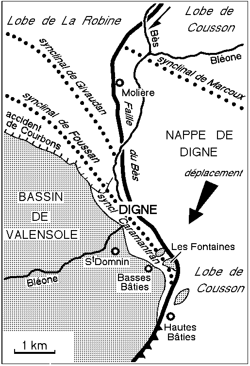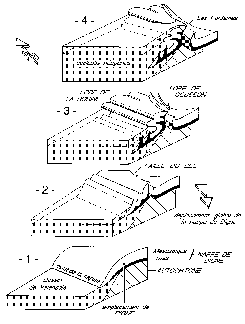 (secteur au nord-ouest de la ville) 2 - Séparation des deux lobes de la nappe par le jeu en coulissement (oblique à la direction de déplacement de la nappe) de la faille du Bès. L'accumulation de sédiments, qui se poursuit dans le bassin de Valensole, bloque et cachète le véritable front de la nappe. 3 - Le lobe de Cousson poursuit son avancée, fronce latéralement le lobe de la Robine dont la partie frontale est ennoyée sous les sédiments du bassin (apparition, dans cette dernière, de structures rétrodéversées). Au nord-ouest de Digne le lobe de la Robine repart en chevauchement par le jeu de l'accident de Courbons. 4 - L'avancée de la nappe est terminée : le remplissage sédimentaire progresse vers l'amont en ennoyant, aux abords sud de Digne, les parties basses du lobe de la Robine (dépôt des cailloutis des Fontaines, etc...) |
