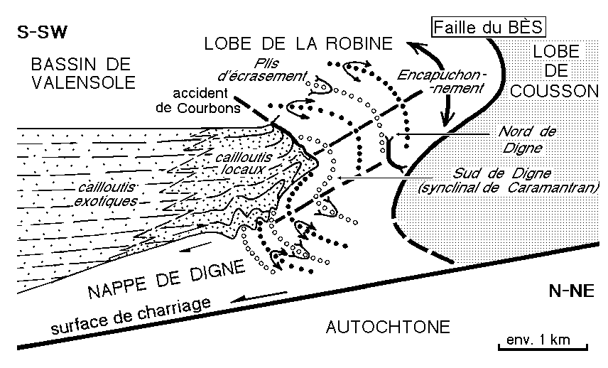 Le jeu coulissant de la faille du Bès apparaît ainsi comme celui d'une déchirure de la nappe qui s'est créée en réaction au blocage de son front : ce blocage est intervenu en bordure sud-occidentale de l'actuel lobe de la Robine, avant la reprise des ultimes mouvements du charriage, sous l'effet du comblement du bassin qui y a recouvert de ses cailloutis néogènes supérieurs la partie la plus frontale de la nappe.