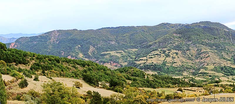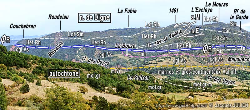 ![]() La crête de la Fubie, vue du nord-ouest depuis l'église de Mélan (voir la suite vers la droite au cliché suivant) (cliché original obligeamment communiqué par Mr. J. Julien). ØR = surface de charriage du lobe de La Robine de la nappe de Digne ; a.M = anticlinal du Mouras (pli d'axe N-S, déversé vers l'ouest) ; s.E = synclinal de l'Esclaye. Les tirets roses soulignent la base de l'"écaille intermédiaire" (Terres Noires et molasses rouges en série renversée) ; les tirets jaunes soulignent la surface de discordance de base de la formation supérieure de Valensole (= D1 des coupes de la page Auribeau). |