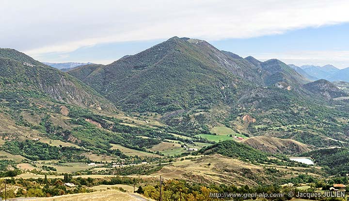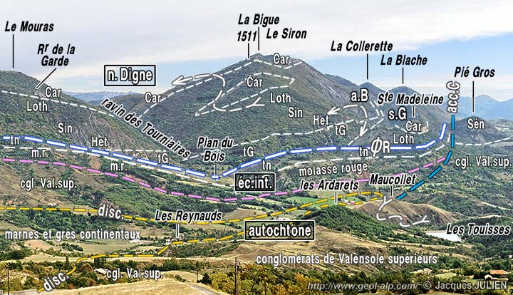 ![]() La montagne du Siron, vue du N-NW depuis l'église de Mélan (suite vers la droite du cliché précédent) (cliché original obligeamment communiqué par Mr. J. Julien). a.B = anticlinal de la Bigue ; s.G = synclinal de Givaudan ; ØR = surface de charriage du lobe de La Robine de la nappe de Digne ; éc.int. = écaille intermédiaire (Terres Noires et molasses rouges en série renversée) ; disc. = surface de discordance de base de la formation supérieur de Valensole (= D1 des coupes de la page Auribeau). |