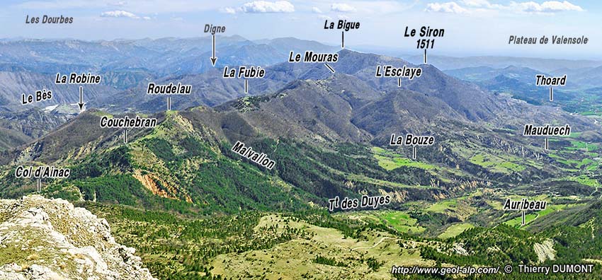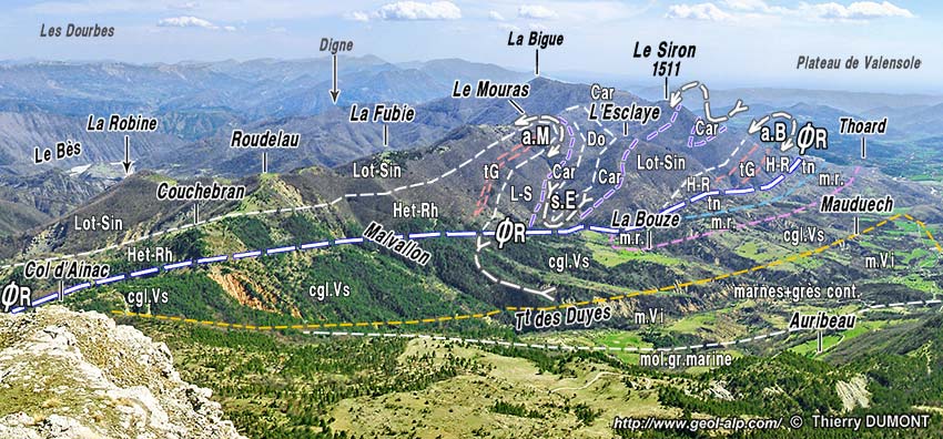 La crête septentrionale du Siron (partie occidentale du lobe de La Robine) et la vallée des Duyes, vue d'ensemble, du nord depuis le sommet de Géruen. (cliché original obligeamment communiqué par Mr. Th. Dumont). ØR = surface de charriage du lobe de La Robine de la nappe de Digne. Les plis affectant le matériel jurassique de la nappe de Digne sont vus, sous cet angle, presque selon leur axe (alors que, plus au sud, ces plis sont plutôt NW-SE (voir les cartes en fin de page) : a.M = anticlinal du Mouras (pli d'axe N-S, déversé vers l'ouest) ; s.E = synclinal de l'Esclaye ; A.B = anticlinal de la Bigue. Les tirets roses soulignent la base de l'"écaille intermédiaire" (Terres Noires et molasses rouges en série renversée) ; les tirets jaunes soulignent la surface de discordance de base de la formation supérieure de Valensole (= D1 des coupes de la page Auribeau). |