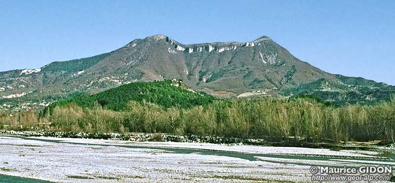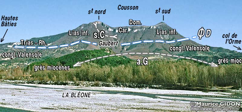 ![]() La crête septentrionale de la Montagne de Cousson vue du nord, depuis les Hautes Siéyes. a.R = anticlinal de Richelme ; s.C = synclinal de Cousson ØD = surface de chevauchement du lobe de Cousson de la nappe de Digne ; f.B = faille du Bès (séparant les deux lobes de la nappe de Digne : lobe de la Robine au NW et lobe de Cousson au SE) . Les tirets orangés correspondent à la surface basale de repos stratigraphique de la formation de Valensole sur la partie frontale du lobe de la Robine de la nappe (voir plus de détails sur ce secteur à la page "Digne"). |