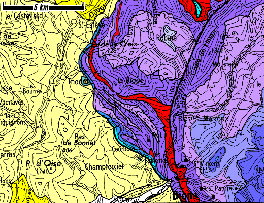 - ensuite en limitant le domaine réellement autochtone de celui, situé plus à l'est, qui a été affecté peu ou prou par les mouvements liés à la mise en place de la nappe de Digne et de l'écaille de Valavoire qui lui est associée.