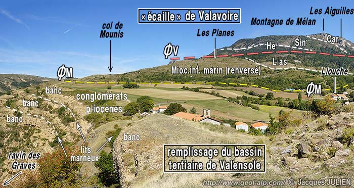 ![]() d'après une image extraite de "google-earth" Les pentes nord-occidentales de la vallée des Duyes vues de l'ouest. ØV = surface de chevauchement de l'écaille de Valavoire ; f.A = faille d'Ainac ; d.M = décrochement de Mélan (masqué sous la formation de Valensole supérieure). Les flèches obliques indiquent l'origine probable des tassements de Mélan (plus hypothétique pour le paquet inférieur que pour le supérieur). |