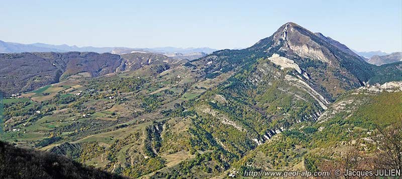 B/ Au nord-est de Mélan le versant est couronné par la Montagne de Mélan. C'est un crêt* qui regarde vers le sud-ouest, dont les couches du Lias et du Dogger plongent vers le NE : elles appartiennent au flanc méridional du grand synclinal d'Authon-Feissal, lequel est le pli le plus méridional de la grande unité tectonique de l'"écaille de Valavoire".