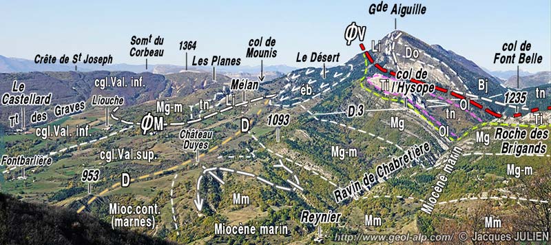 De fait, au sud de ce chevauchement, dans le revers sud de ce col et de la crête de la Roche des Brigands, affleurent des couches du Jurassique supérieur, sub-verticales et orientées E-W (voir la page "Auribeau"). Leur succession "base au nord" se poursuit par les molasses marines miocènes appartenant au flanc nord du synclinal d'Auribeau, lesquelles reposent transgressivement sur le Tithonique. C'est visiblement celle d'un flanc sud d'anticlinal, dont la montagne de Mélan représentait sans doute originellement le flanc nord et dont la charnière (sans doute érodée à l'Oligocène) a été rompue par le chevauchement de la Grande Aiguille : ainsi le jeu de ce chevauchement n'apparaît plus ici que comme celui d'un accident secondaire purement local dont la flèche ne permettait pas au front de l'écaille de Valavoire de s'être avancé là au point de recouvrir le Miocène autochtone d'Auribeau (il est à noter cet "amortissement frontal" implique sans doute que le Miocène d'Auribeau ait absorbé une partie du mouvement vers le sud qui a déplacé l'écaille de Valavoire).