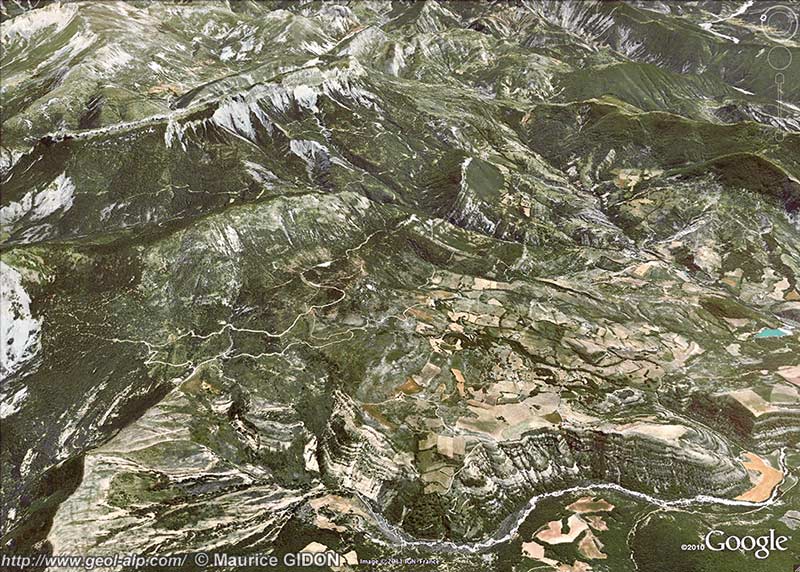 ![]() d'après une image extraite de "google-earth" L'extrémité méridionale de l'écaille de Valavoire et sa place dans son contexte régional, vue depuis le sud-ouest. s.A = synclinal d'Auribeau et du Haut Vançon ; ØV = chevauchement de Valavoire ; d.M = décrochement de Mélan ; f.A = faille d'Ainac (= accident des Monges) ; f.B = faille du Bès. Les demi-flèches indiquent le sens relatif du compartiment sur lequel elles sont placées, par rapport à celui qui lui est juxtaposé. |