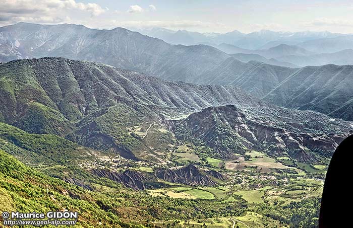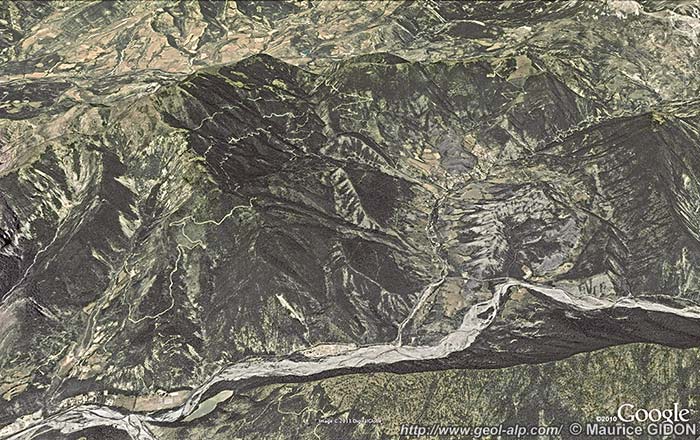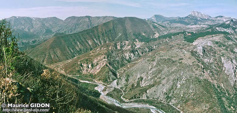![]() La cuvette de La Robine et les crêtes de sa bordure méridionale, vues de l'E-SE (vue pseudo-aérienne obtenue à l'aide de "google-earth") ØR = chevauchement du bord occidental de la nappe de Digne (Lobe de la Robine) ; f.B = faille du Bès (séparant le Lobe de la Robine du corps principal de la nappe) s.G = synclinal de Givaudan ; a.B = anticlinal de la Bigue et du Bramefan ; s.R = synclinal de La Robine ; a.M = anticlinal du Mouras : son axe est beaucoup plus N-S que celui des plis plus méridionaux, du fait de la torsion de sens horaire qui affecte les plis le long de la marge occidentale du lobe de la Robine. La vue donnée par cette image peut être complétée par celle, d'orientation orthogonale, de la page "amont de Digne". |
