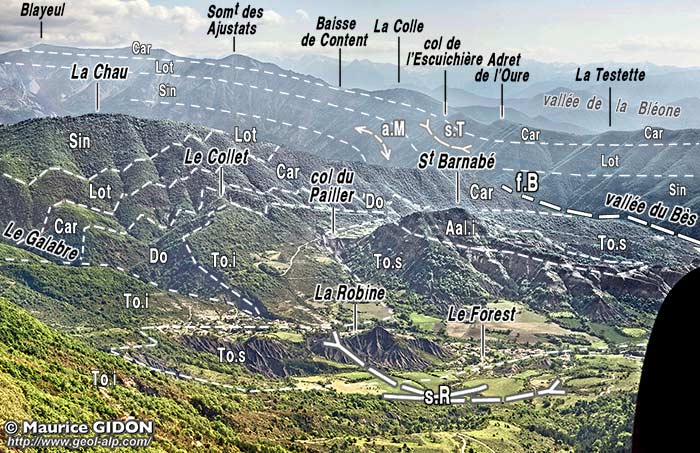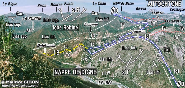 Entre Tanaron et La Robine la rive droite du Bès donne une coupe du bord septentrional du lobe de La Robine. Au delà de la crête de La Chau, qui est un simple crêt liasique fermant la cuvette de La Robine, le matériel triasique de la nappe de Digne affleure largement : ici on voit apparaître, sous les habituels gypses du Trias supérieur, leur soubassement de dolomies du Trias moyen. Ces dernières affleurent selon une bande NW-SE qui chevauche la formation olistolitique tertiaire de Tanaron. La surface du chevauchement de la nappe, inclinée vers le SW sous la montagne de La Chau, y change assez brutalement d'attitude avant d'atteindre la vallée du Bès pour plonger vers le SE, en même temps que prend naissance par la faille du Bès.