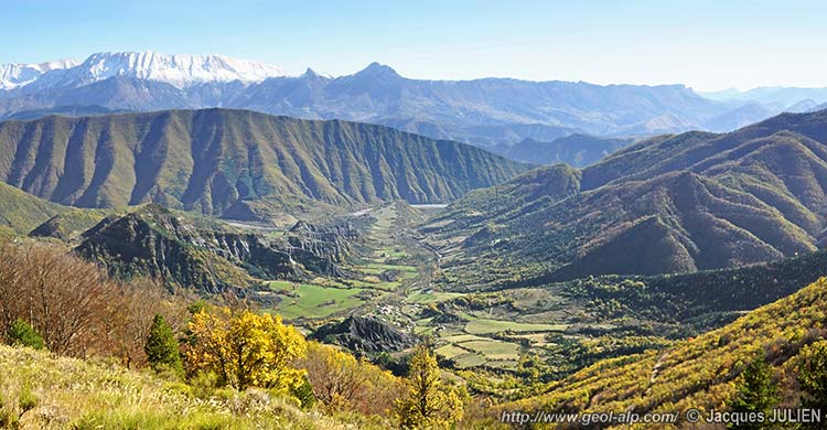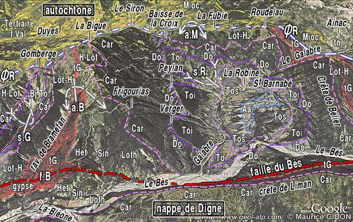 là la marge nord du bassin tertiaire de Valensole, pour déborder sur le contenu sédimentaire de ce bassin. Or cette marge était ourlée par le bourrelet de terrains tertiaires qui y avait déjà été édifié, au front de l'écaille de Valavoire (voir la page "Auribeau") par l'avancée de cette dernière (ce qui avait créé le puissant synclinal couché
