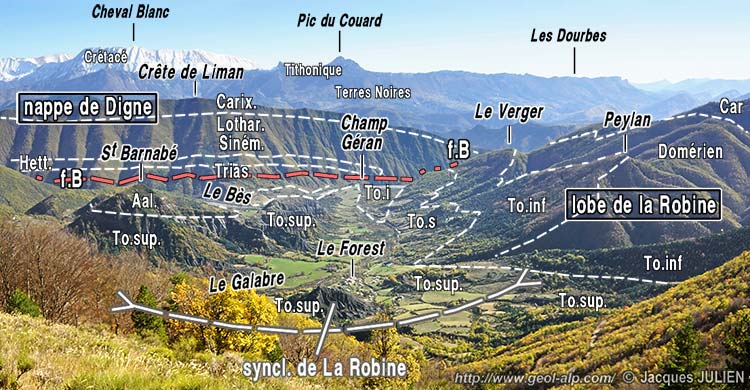 Ce décalage montre que la faille du Bès a joué en décrochement dextre ; mais le fait que sa lèvre orientale est beaucoup moins raccourcie par le plissement que sa lèvre occidentale (constituée par le lobe de la Robine) indique que ce n'est pas une cassure de décrochement postérieure au plissement de la nappe, mais bien plutôt une déchirure qui a fonctionné au cours du charriage (on trouvera des explications complémentaires à la page consacrée à une vue d'ensemble des environs de Digne).