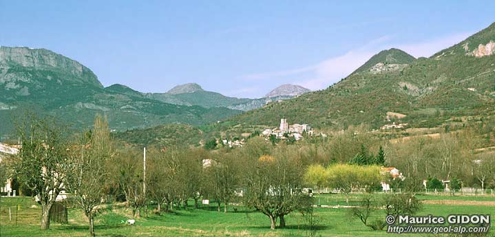 Le village de Thoard lui même est édifié en rive gauche, un peu au dessus du thalweg du torrent des Duyes et ses maisons sont construites sur des marnes bariolées qui s'intercalent ici entre la partie inférieure et la partie supérieure des lits de cailloutis de la formation de Valensole.