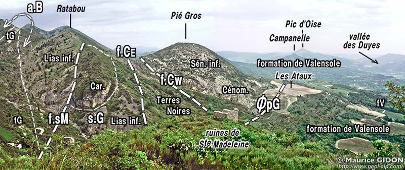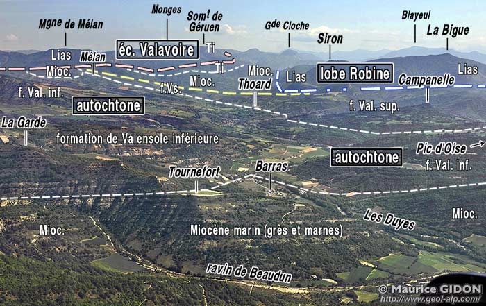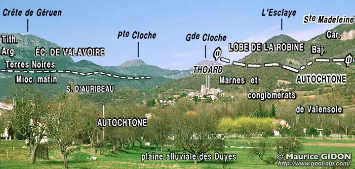 Au nord-est de Thoard, à partir de la butte de Sainte-Madeleine, le couloir tectonique de Courbons s'interrompt en même temps que la limite nappe - autochtone s'infléchit pour s'orienter SW-NE. Cette inflexion du tracé de la ligne qui sépare le lobe de la Robine de son autochtone n'est pas seulement due à l'érosion car elle s'accompagne d'un changement du caractère de cette limite qui devient un vrai chevauchement (voir la page "Siron").