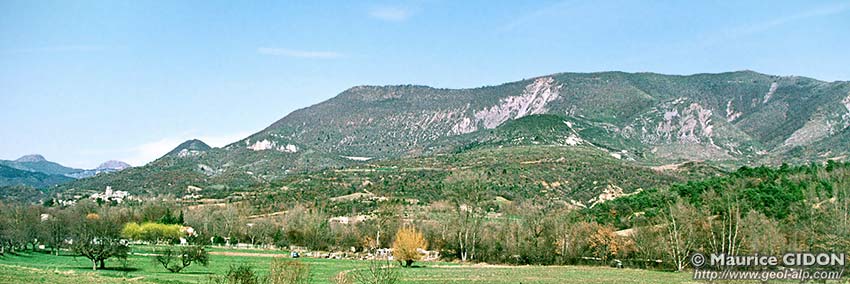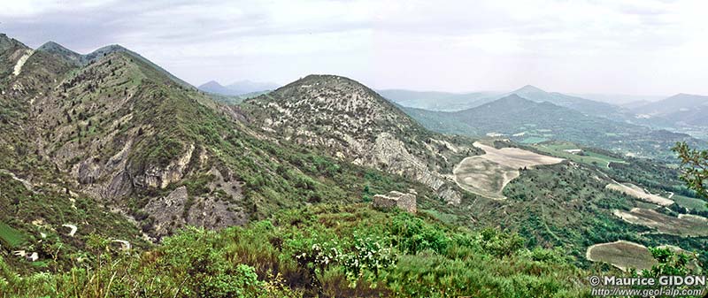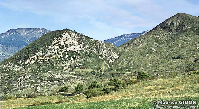 Du côté oriental ces pentes sont dominées par celles, beaucoup plus montagneuses, de la crête du Siron, qui culmine au sommet de La Bigue (1653). Ce chaînon est constitué par les terrains du Trias et du Lias qui appartiennent au "lobe de la Robine" de la nappe de Digne. Ces couches surplombent les couches de la formation de Valensole, mais la dislocation tectonique qui les en sépare s'avère constituée par un système de failles parallèles à pendage très redressé, proche de la verticale (voir la page "Siron").