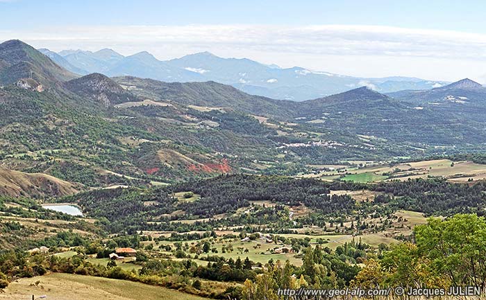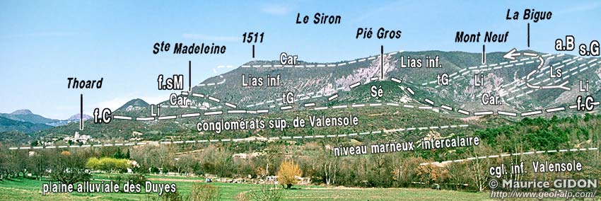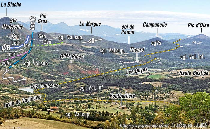 La basse vallée du torrent des Duyes s'engage franchement, à partir des abords amont de Thoard jusqu'à Barras, son confluent avec la Bléone, dans les alternances de marnes et de conglomérats continentaux de la formation de Valensole. Leurs couches, à litage très flou (voir leur aspect à la page "stratigraphie"), sont régulièrement et uniformément inclinées vers le sud-est avec un pendage faible, de l'ordre de 20°. Le relief qui en résulte est mou, formé de collines surbaissées, comme le cône régulier du Pic d'Oise, que séparent quelques profondes ravines.