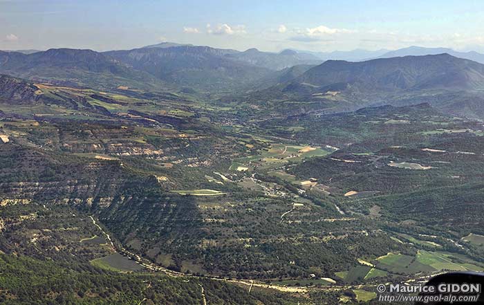 ![]() La vallée des Duyes, vue d'ensemble du SSW, depuis l'aval, d'avion. |