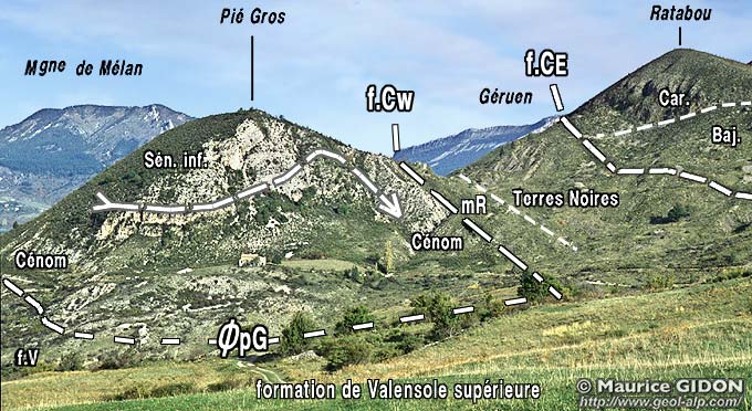 La butte de Pié-Gros se situe du côté occidental de ce couloir de failles et ses couches butent contre lui. Elle est d'autre part remarquable par le fait qu'elle est constituée de Crétacé supérieur dont les couches reposent pratiquement à plat sur les conglomérats de Valensole supérieurs du compartiment autochtone. Cette situation en fait objectivement une klippe*, mais l'interprétation de sa présence à cet endroit pose un problème difficile : en effet les terrains de cet âge ne sont pas représentés, aux alentours, ni dans le matériel de la nappe, ni vraisemblablement dans l'autochtone (où, de toutes façons ils n'auraient pu être prélevés car ils étaient masqués sous l'épaisse chape du Tertiaire) : leur origine et leur processus de mise en place sont donc très énigmatiques.
